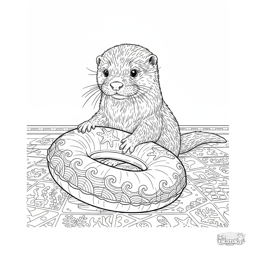 Detailliertes Ausmalbild für 10-12 Jahre: Ein realistisches Otter-Junges untersucht neugierig einen Schwimmring am Poolboden. Felltextur, ausdrucksstarke Pose.