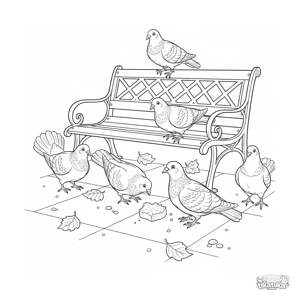 Detailliertes realistisches Ausmalbild für Kinder 10-12: Ein Schwarm Stadttauben an einer Eisenbank im Park. Wissenschaftlicher Illustrationsstil.
