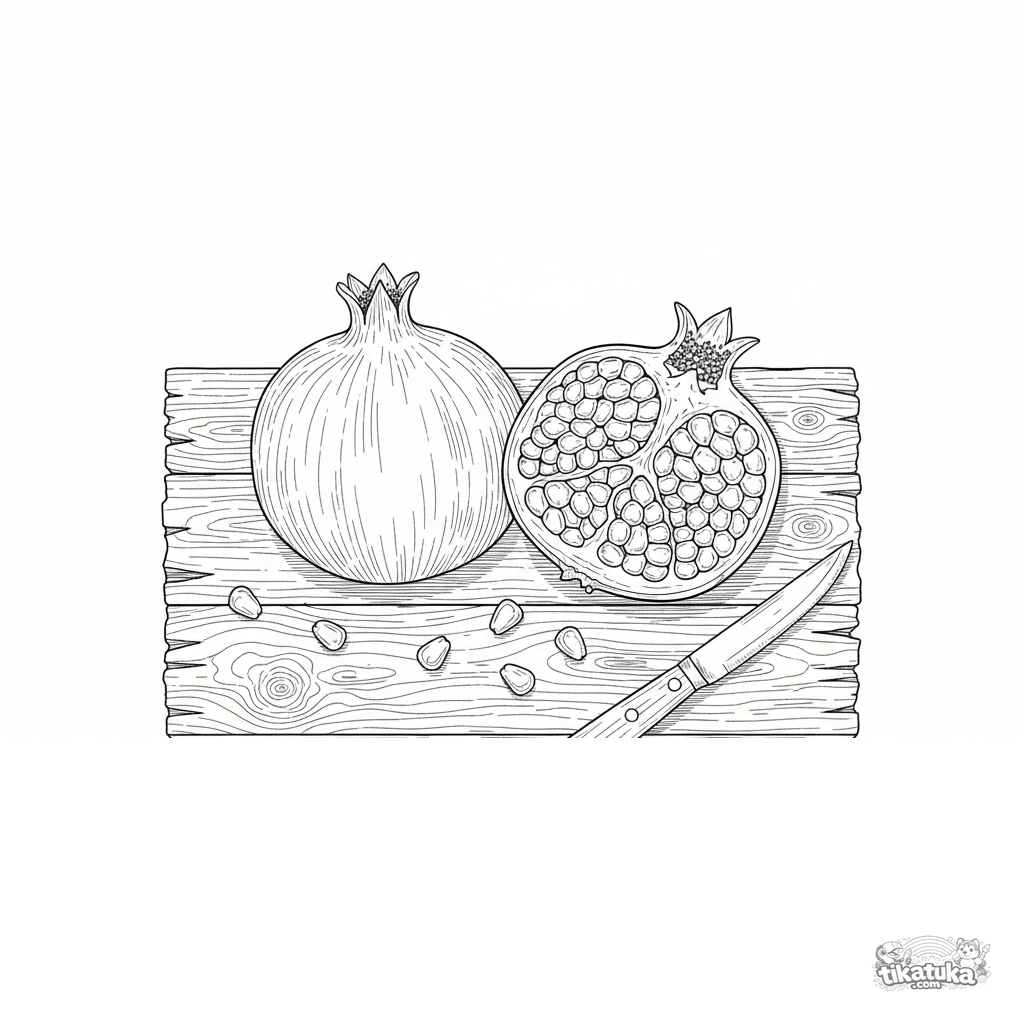 Detailliertes realistisches Ausmalbild von Granatapfelhälften. Für ältere Kinder von 10-12 Jahren. Zeigt ganze Frucht, Querschnitt mit Kernen, Messer und verstreute Kerne.