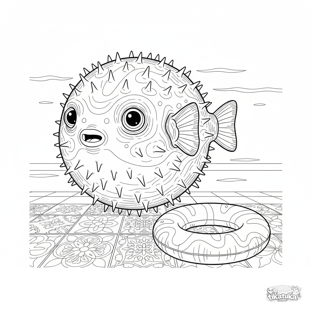 Komplexes Ausmalbild für ältere Kinder 10-12: Ein realistischer Kugelfisch im Stil eines alten Stichs bläht sich am Poolboden auf. Detaillierte Stacheln, Hauttextur und ein Schwimmring.