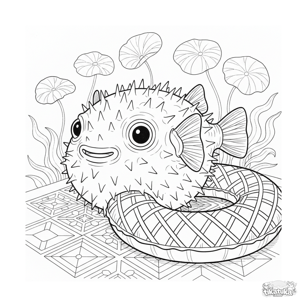Detailliertes Ausmalbild im realistischen Stil: Ein Kugelfisch ruht auf den Fliesen in der Nähe eines aufblasbaren Rings am Schwimmbadboden.