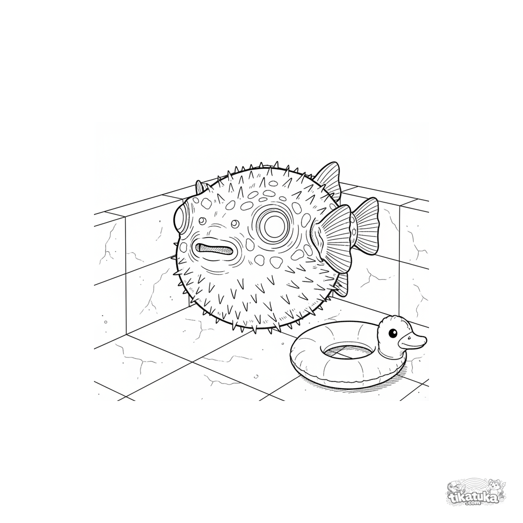 Kompliziertes Ausmalbild eines realistischen Kugelfischs in einer Poolecke. Für ältere Kinder von 10-12 Jahren.