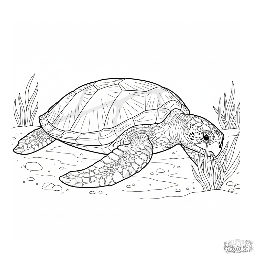 Komplexes realistisches Ausmalbild für Ältere 10-12: Eine Meeresschildkröte weidet Seegras in einer sonnigen Lagune ab. Hohe Detailtreue.