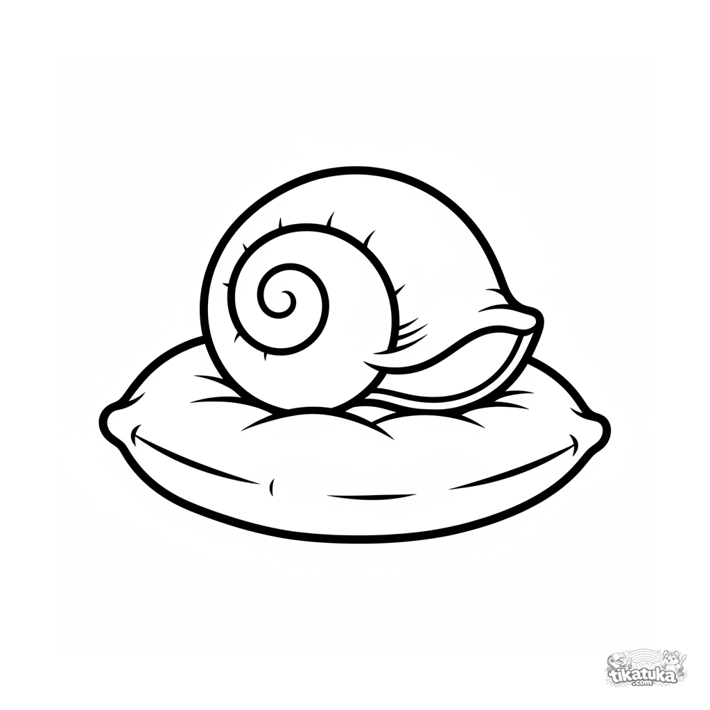 Ausmalbild für Kleinkinder: eine große Muschel im realistischen Stil ruht auf einem Kissen. Einfache Spiralform, klarer Umriss, keine komplexen Muster.