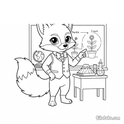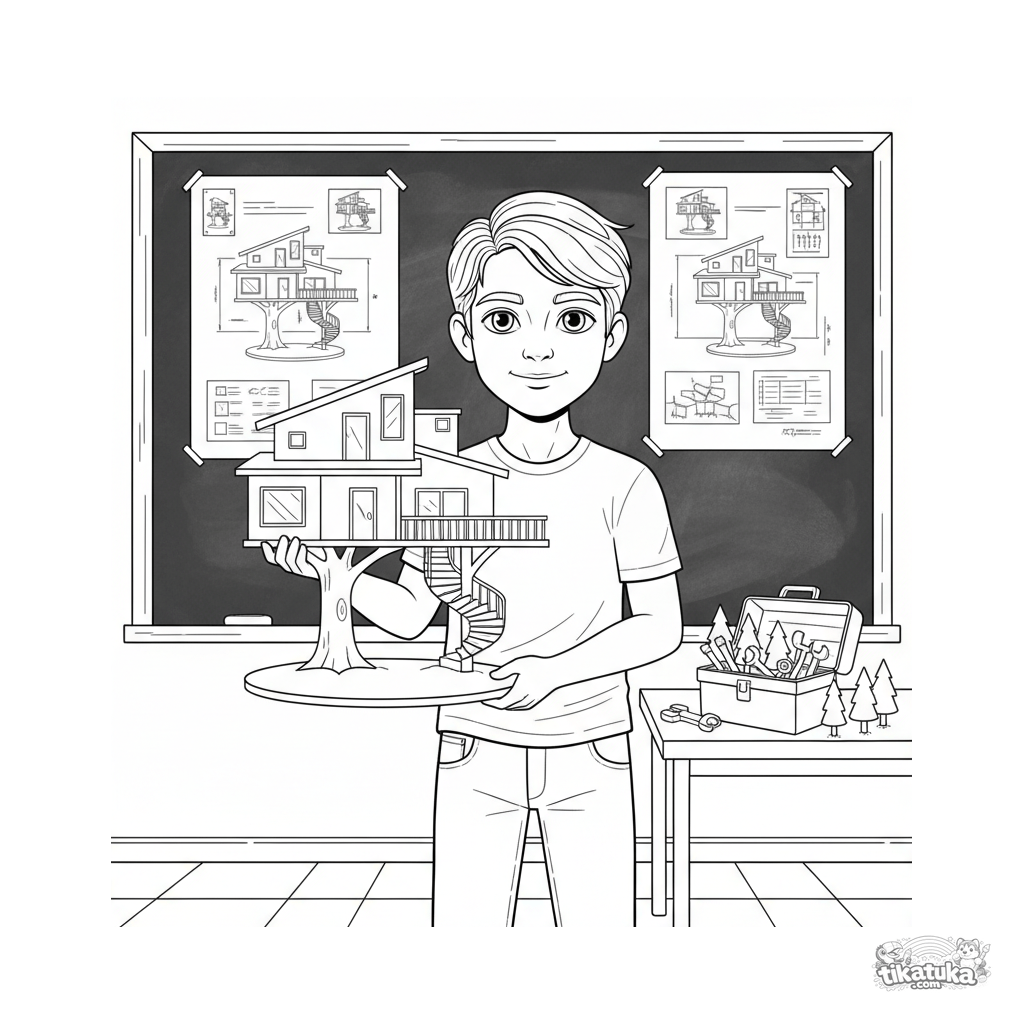 Ausmalbild für 7-9 Jahre: Schüler-Architekt im Klassenzimmer präsentiert Baumhaus-Modell. Realistischer Stil, detaillierte Blaupausen an der Tafel.