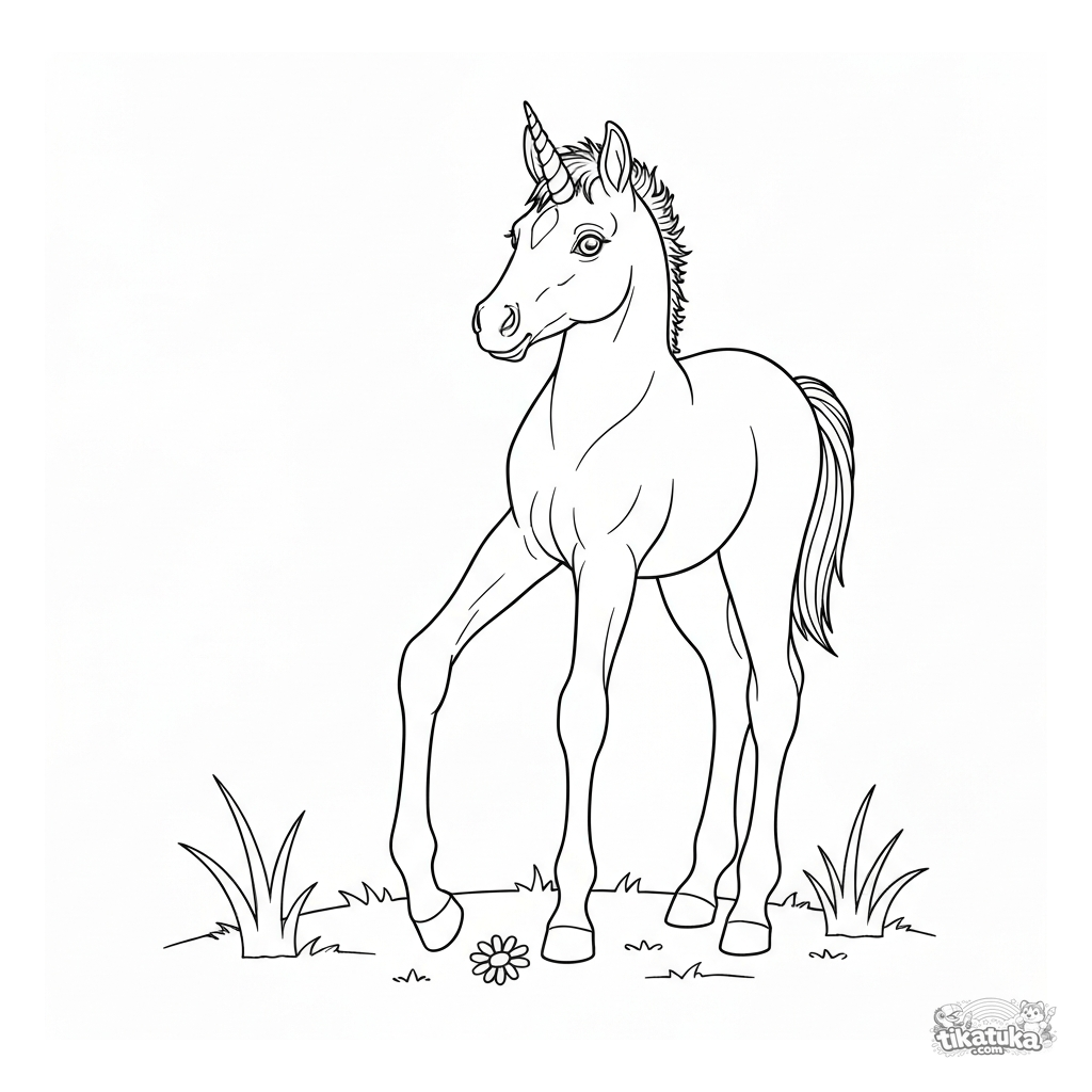 Realistisches Ausmalbild für Kinder: Ein Einhornfohlen mit spiralförmigem Horn steht auf einer Wiese. Einfache, friedliche Szene mit Gras.