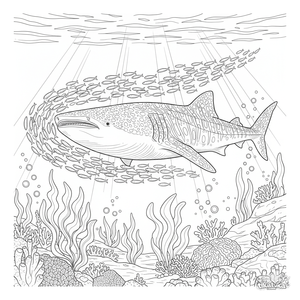 Detailliertes Ausmalbild eines Walhais, der durch ein farbenfrohes Korallenriff schwimmt. Für ältere Kinder von 7-12 Jahren. Enthält Korallen, Fischschwärme und Unterwasserlichtstrahlen.