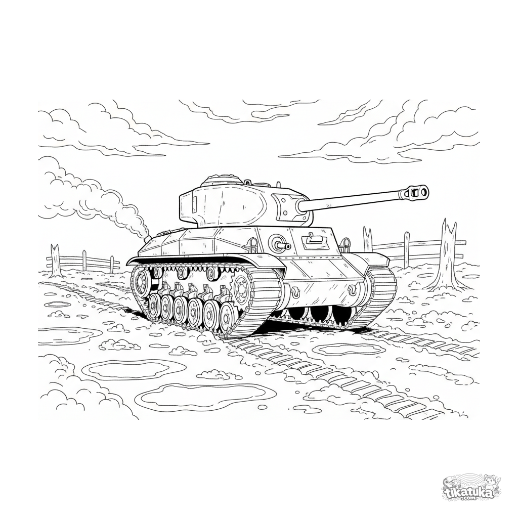 Ausmalbild eines realistischen Panzers aus dem Zweiten Weltkrieg auf einem Schlammfeld. Für Jungen von 7 bis 12 Jahren.