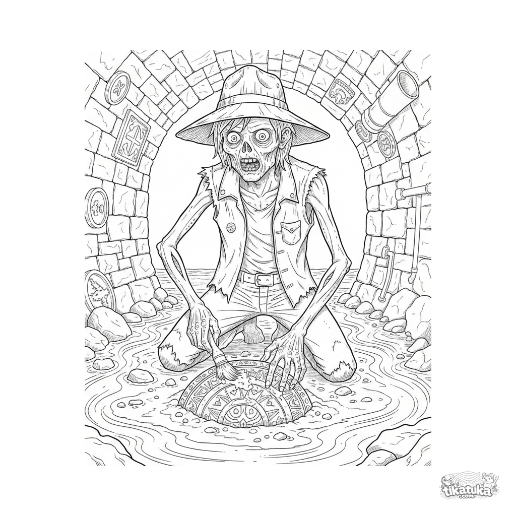 Komplexes Ausmalbild für Kinder 10-12: ein realistischer Zombie-Archäologe entdeckt ein Artefakt im Abwasserkanal. Vintage-Gravurstil, viele Details.