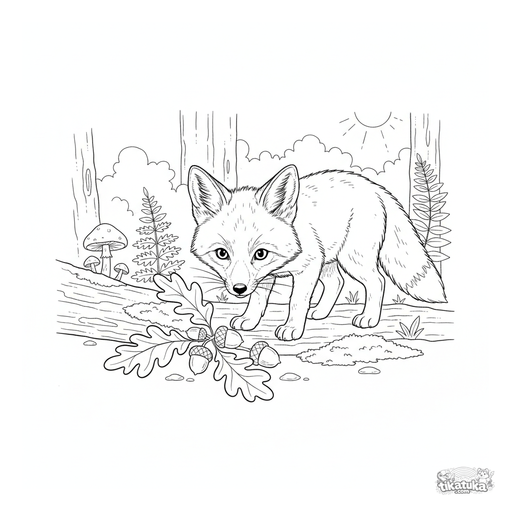 Ausmalbild für Kinder 4-6: ein neugieriges Fuchsjunges erkundet den Herbstwaldboden mit Eicheln und Blättern. Ganzer Körper sichtbar mit klaren Umrissen.