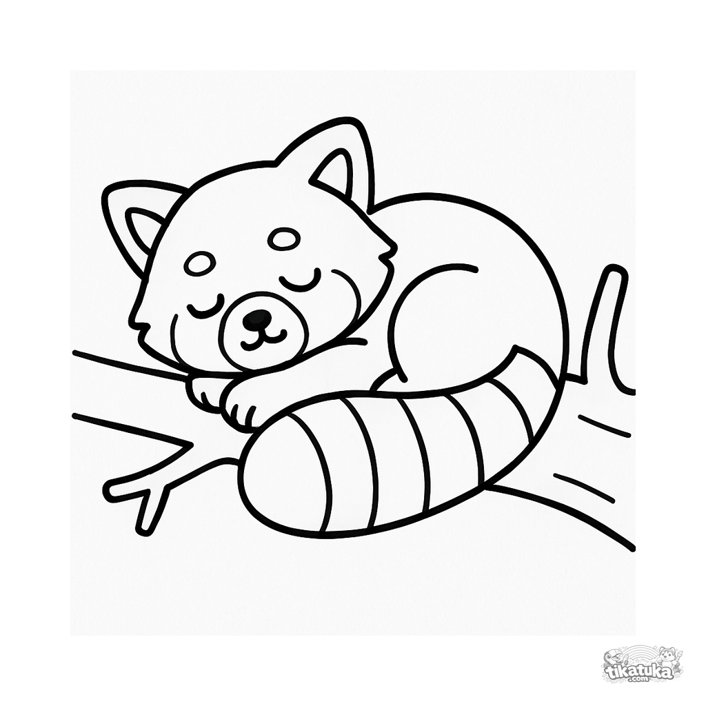 Ausmalbild für Kinder. Ein flauschiger roter Panda schläft zusammengerollt auf einem dicken Ast, eingehüllt in seinen buschigen Schwanz. Kostenlos herunterladen.