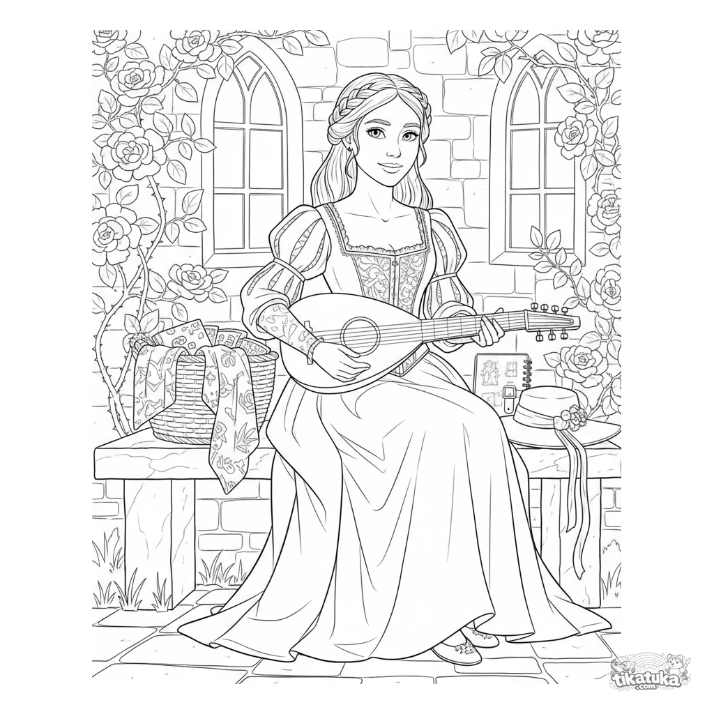 Ausmalbild für 10-12 Jahre: ein detailliertes Renaissance-Markt-Kleid in einem sonnigen Schlosshof. Enthält eine Laute, Nähaccessoires und architektonische Hintergrunddetails.