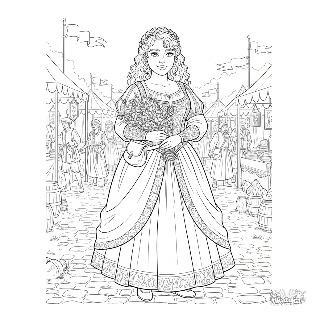 Detaillierte Malseite: Eine Figur in voller Renaissance-Messekleidung. Puffärmel-Hemd, geschnürtes Korsett, mehrlagiger Rock, Szene mit Händlerzelten und Fahnen für Mädchen 10-12.