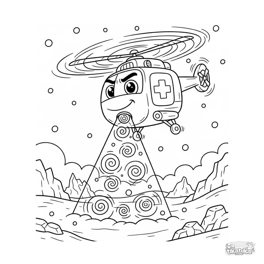 Ausmalbild für Kinder von 4-6 Jahren: ein Rettungshubschrauber in einem arktischen Schneesturm. Dynamische Szene, klare Formen.