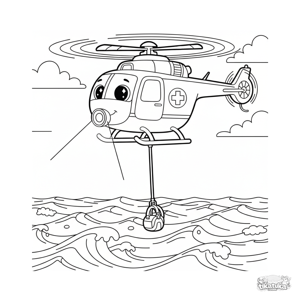 Ausmalbild eines Rettungshubschraubers, der über dem Ozean schwebt. Für Kinder von 7 bis 9 Jahren. Fette Umrisse, dynamische Pose.