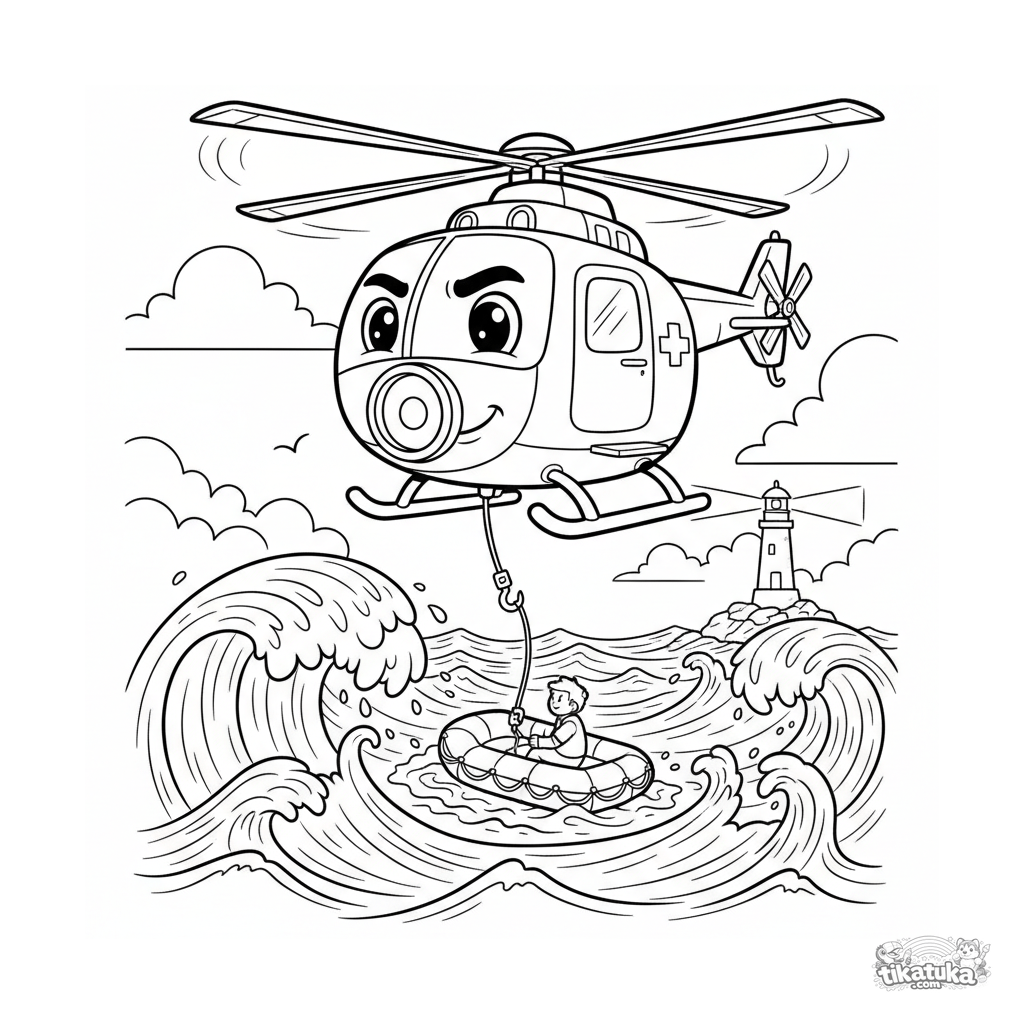 Ausmalbild eines Rettungshubschraubers, der über einem stürmischen Ozean schwebt. Für Kinder von 4-6 Jahren. Dynamische Szene, klare Formen.