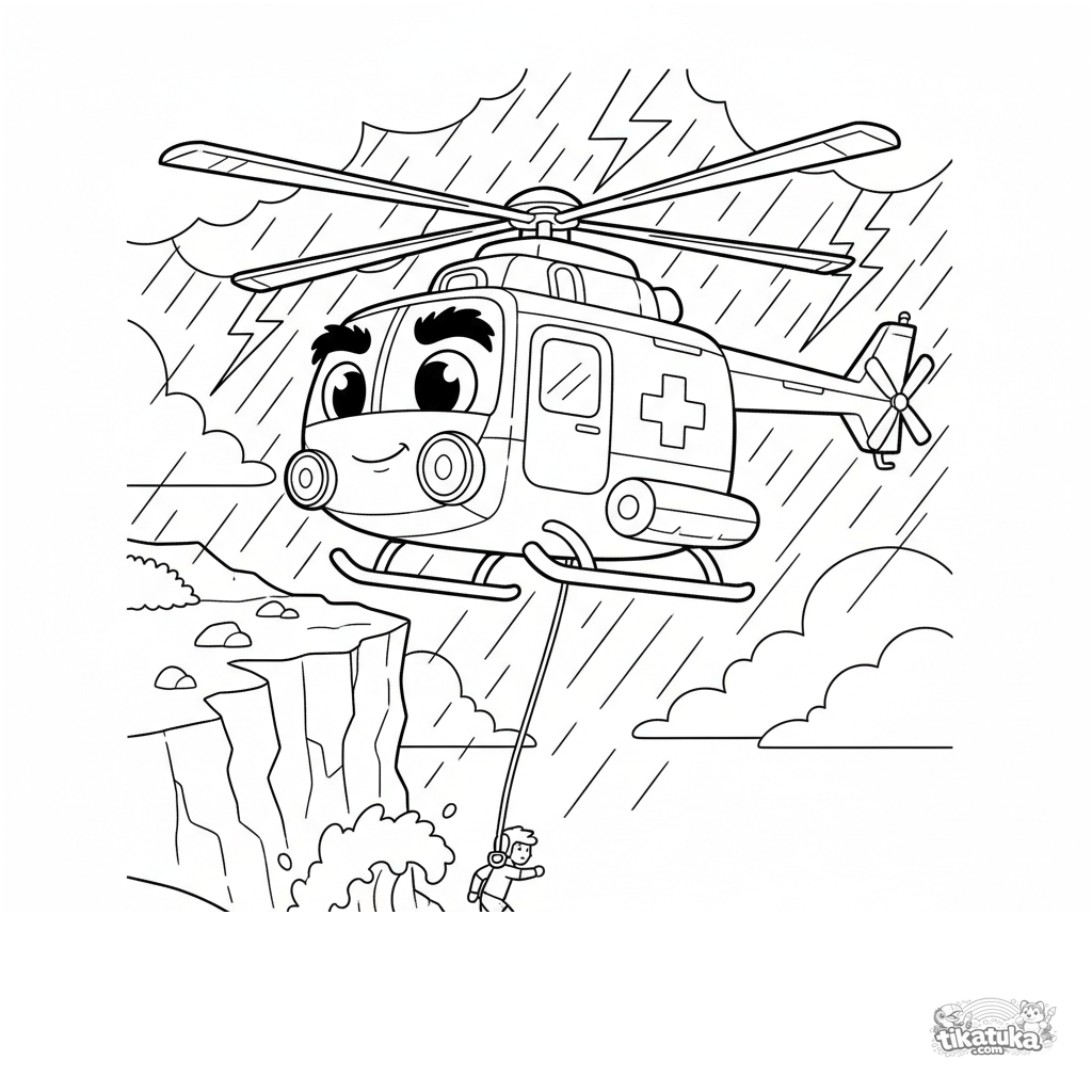 Dynamisches Ausmalbild eines Rettungshubschraubers im Einsatz bei einem Sturm an einer felsigen Klippe. Für Kinder von 7-9 Jahren. Ausdrucksstarke Linien, dramatische Szene.