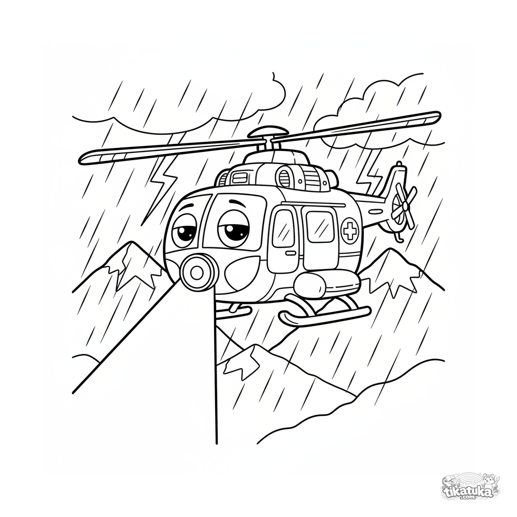 Ausmalbild eines Rettungshubschraubers im Einsatz in einer stürmischen Bergnacht. Für 7-9 Jahre. Dramatische Szene, Suchscheinwerfer und Hubschrauberdetails.