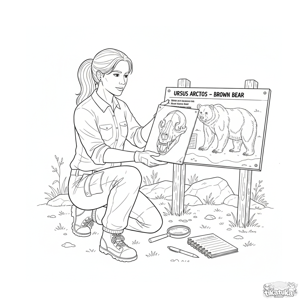 Ausmalbild für Kinder von 10-12 Jahren. Ein Wildtierforscher vergleicht ein wissenschaftliches Diagramm eines Bärenschädels mit Informationen auf einem Zoo-Schild. Detaillierte edukative Szene.