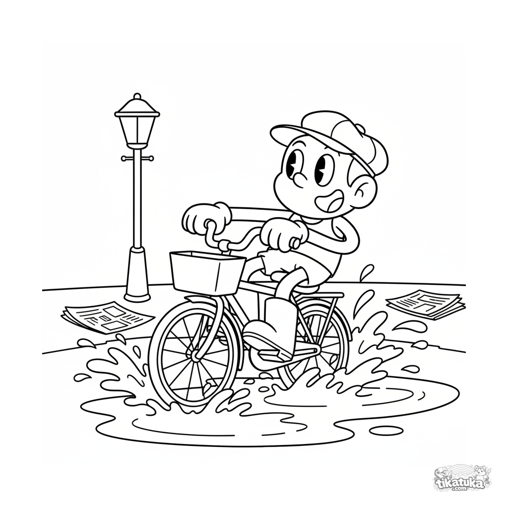Ausmalbild für Kinder 7-9 Jahre im Retro-Stil der 1930er: eine fröhliche Figur fährt mit dem Fahrrad durch eine große Pfütze. Dynamische Pose, Spritzer.