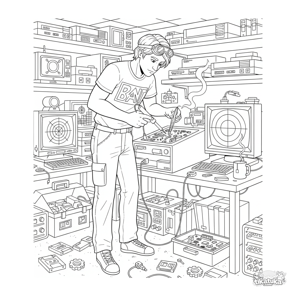Hochdetailliertes Ausmalbild: Ein Retro-Tech-Sammler lötet eine Platine in einer Kellerwerkstatt. Für Kinder von 10-12 Jahren.