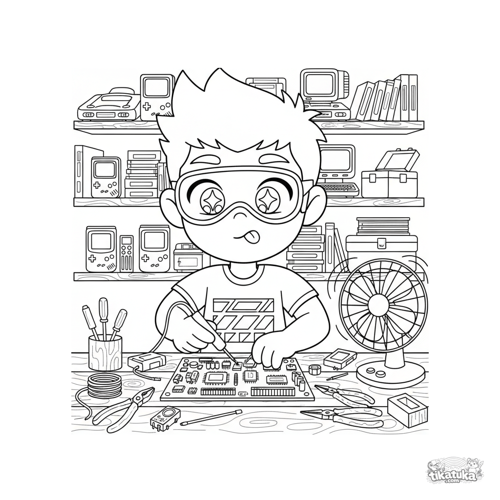 Ausmalbild für Kinder von 10-12 Jahren: ein Retro-Tech-Sammler lötet ein Motherboard im Keller. Details: Regale mit Konsolen, Werkzeuge, Tischventilator. 90er Nickelodeon Stil.