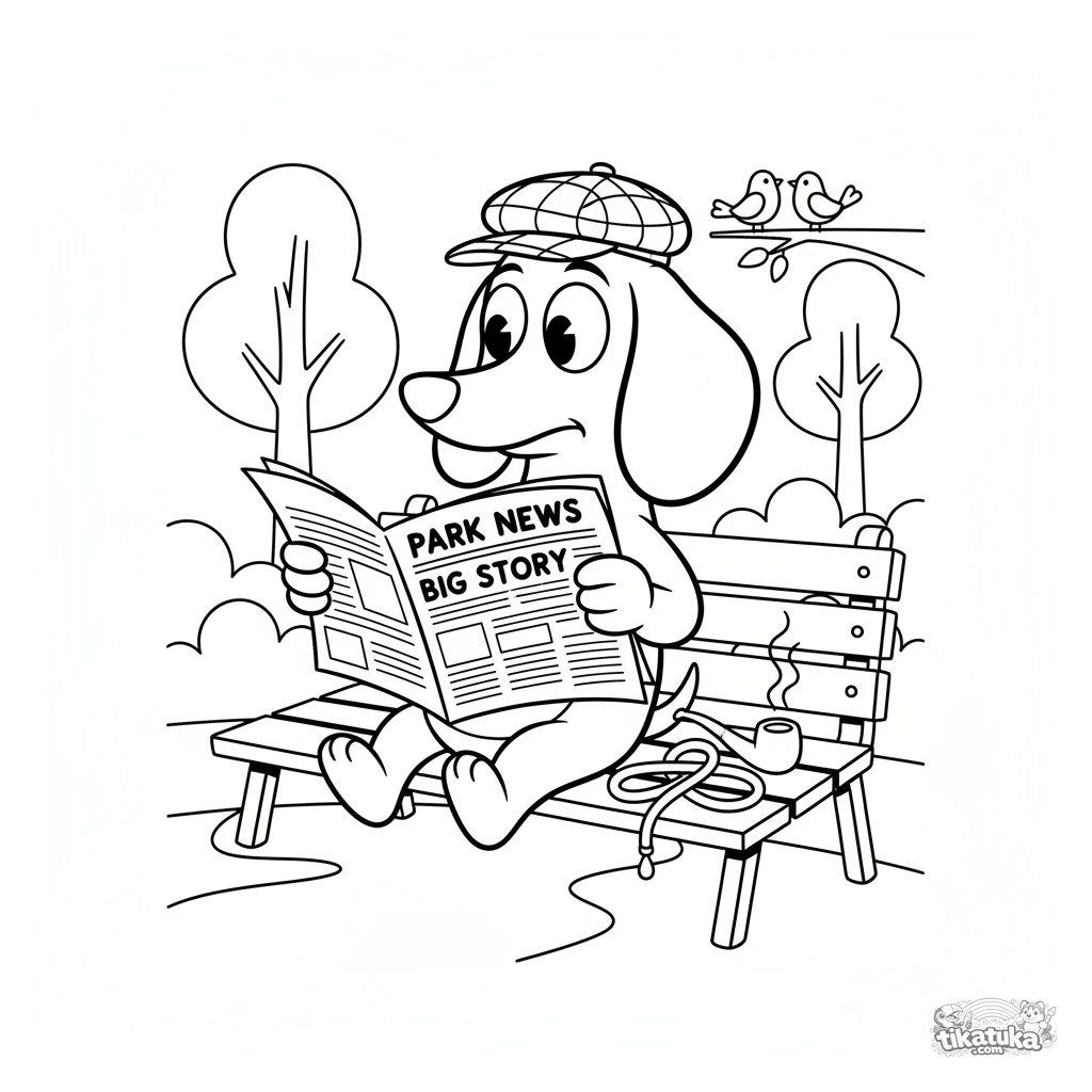 Ausmalbild für Kinder von 7-9 Jahren im Retro-Stil: Ein Dackel mit Flachmütze liest konzentriert eine Zeitung auf einer Parkbank.