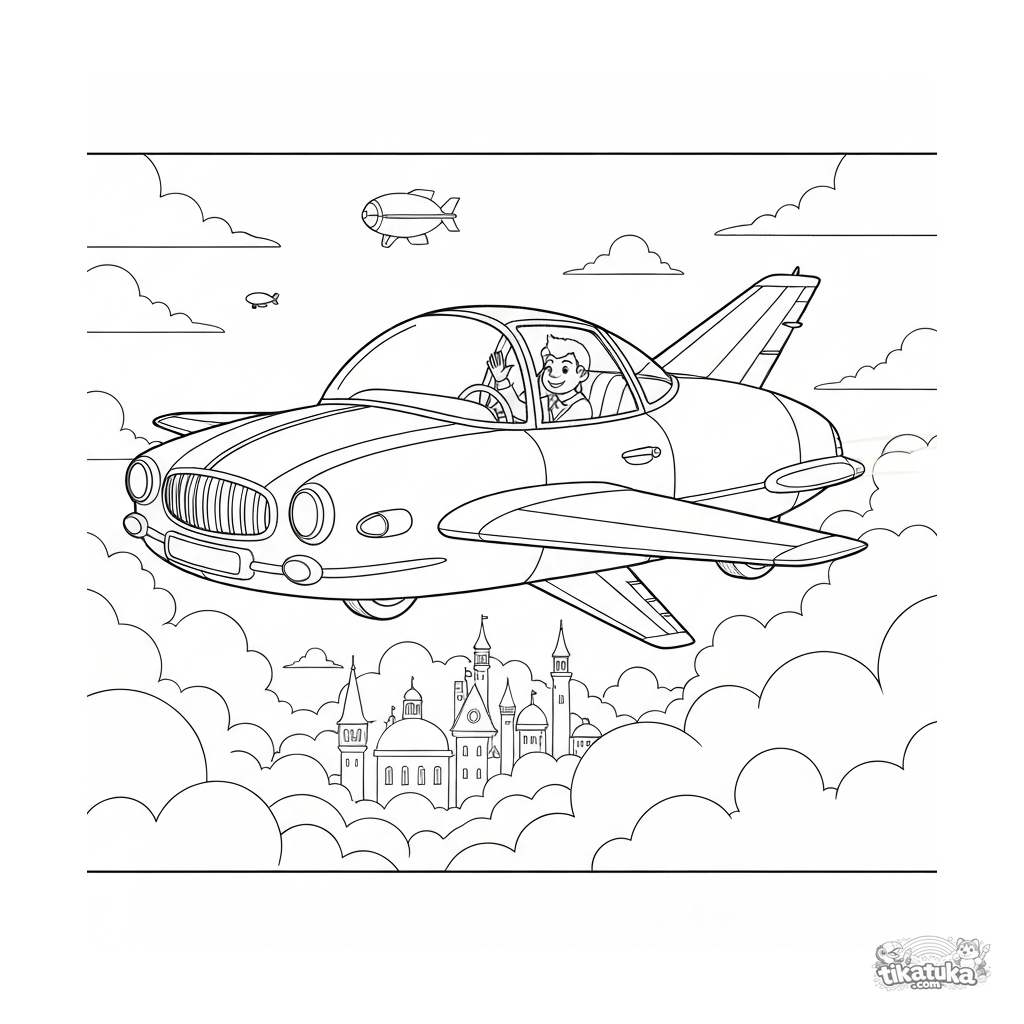 Detailliertes Ausmalbild eines Retro-Flugautos, das über einer Wolkenstadt schwebt. Für Kinder ab 8 Jahren.
