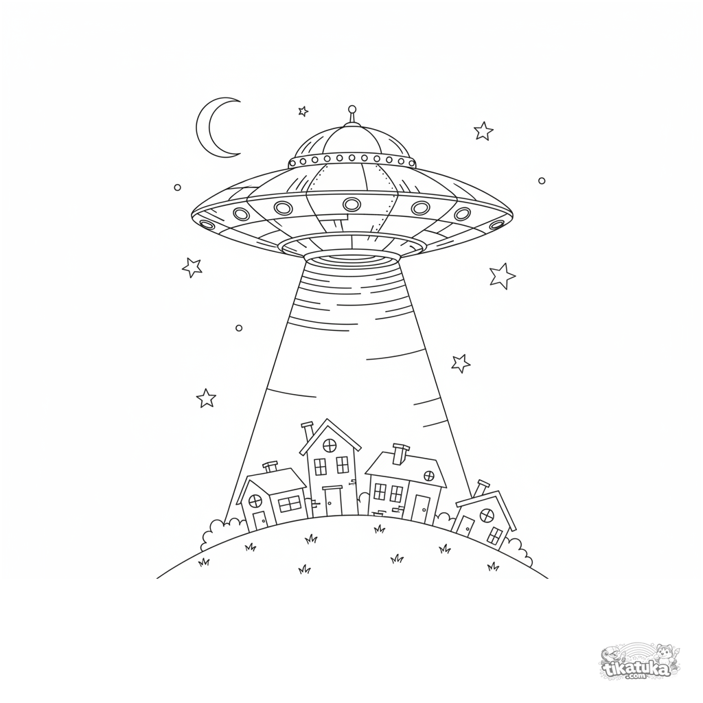 Schwieriges Ausmalbild für Jungen 8-12: Eine Retro-Fluguntertasse schwebt über einer schlafenden Stadt bei Nacht. Hohe Detailgenauigkeit, realistischer Stil.