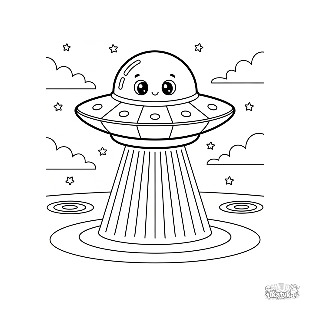 Ausmalbild für Jungen 4-6: Eine Retro-Fluguntertasse schwebt über Kornkreisen. Interessante Szene mit klaren Details zum Ausmalen.