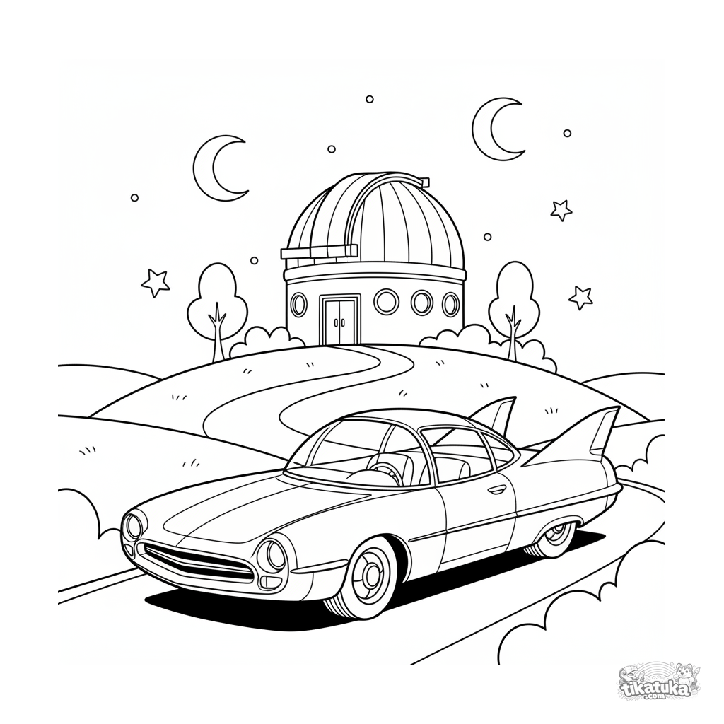 Ausmalbild für Jungen 4-6: Ein stylisches retro-futuristisches Auto in Raketenform, geparkt vor einem Observatorium. Klare Umrisse, interessantes Design.