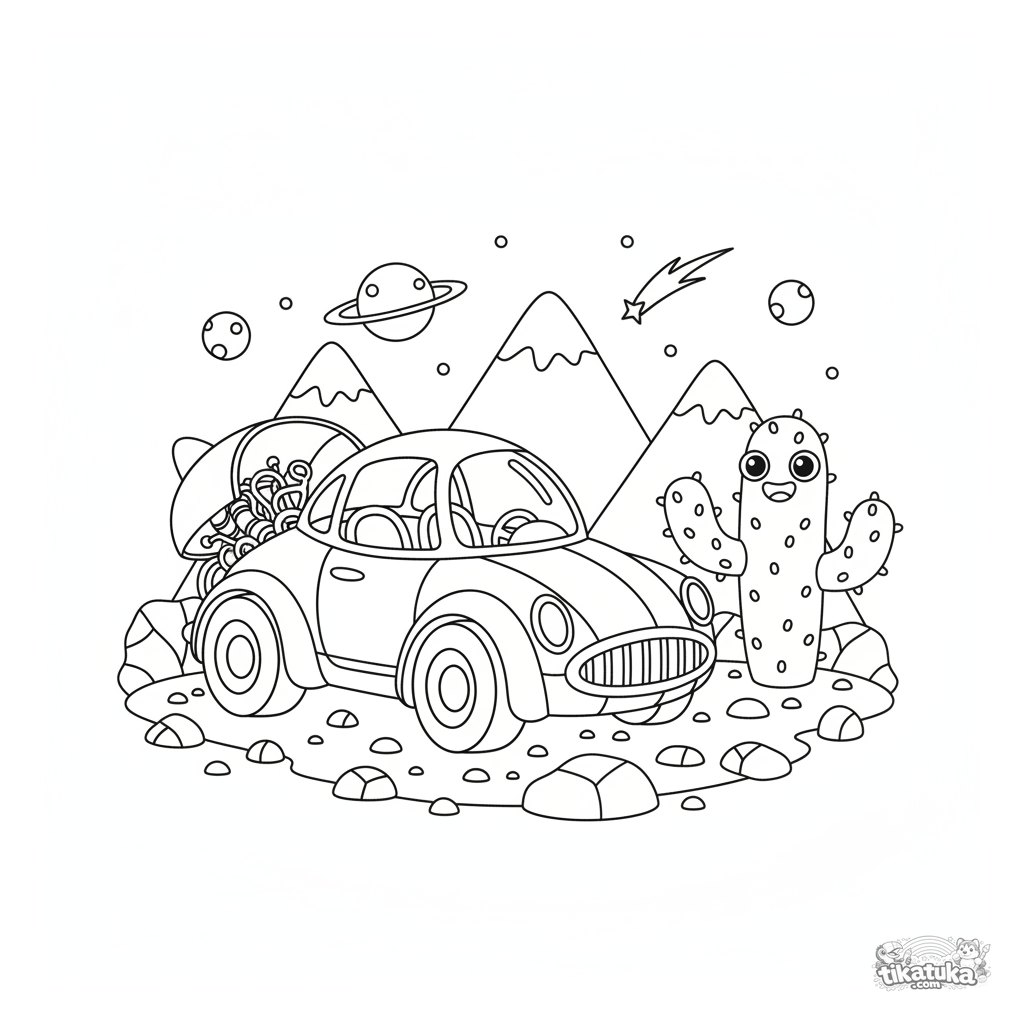 Ausmalbild für Jungen 4-6: Ein retro-futuristisches Raketenauto parkt auf einer Marslandschaft.