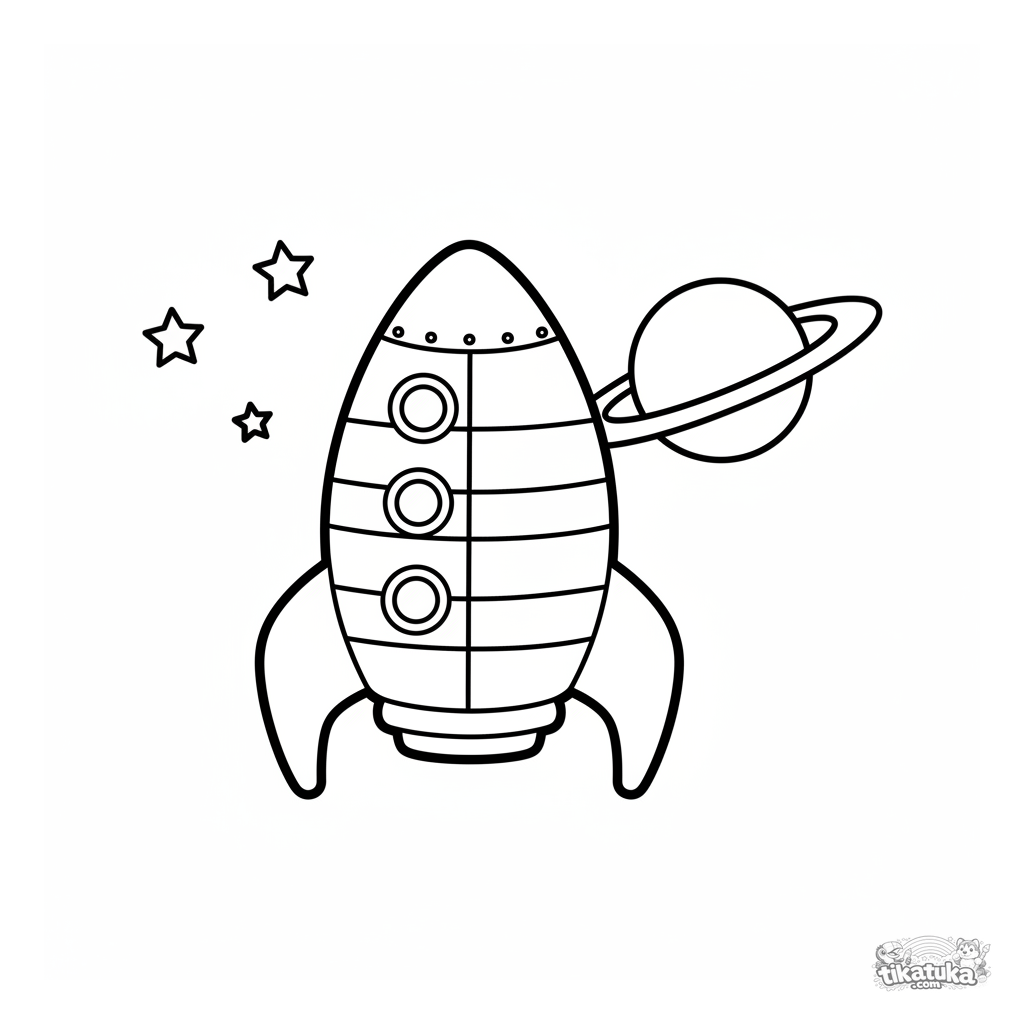 Kleinkind Ausmalbild 2-3 Jahre: Eine stylische Retro-Rakete mit Flossen und Bullaugen schwebt nahe dem Umriss eines Ringplaneten. Große, einfache Formen.