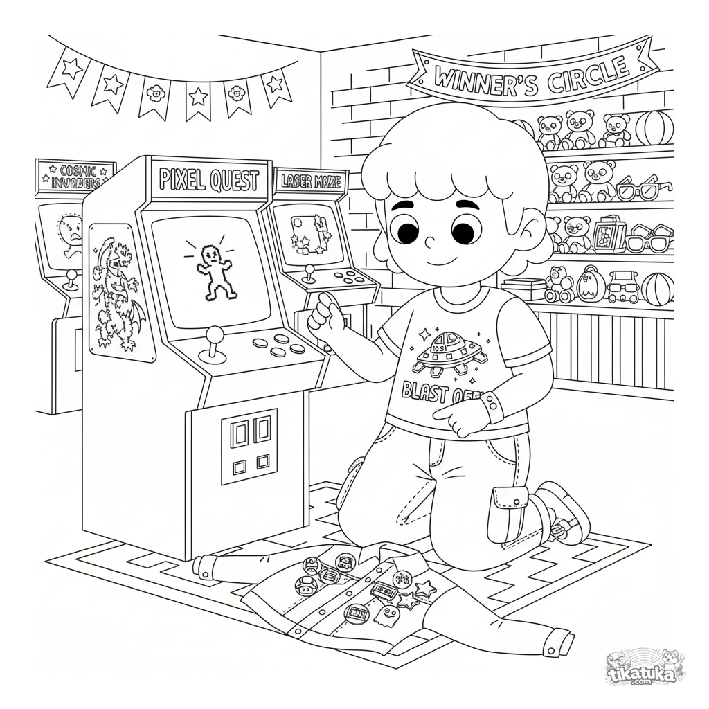 Ausmalbild für Kinder von 7-12 Jahren: ein Retro-Gamer-Kind im Arcade-Raum, das eine Sammlung von Emaille-Pins ordnet.