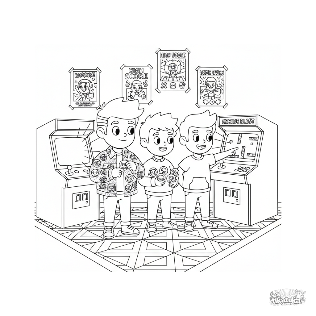 Ausmalbild für Kinder von 7-12 Jahren: Ein Retro-Gamer-Trio sammelt Pins in einem lebendigen Arcade-Raum. Detaillierte Szene mit Automaten, Postern und Teppich.