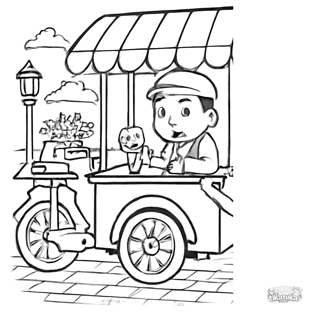 Ausmalbild eines Retro-Eistrikes für Kinder von 5-8 Jahren. Ein altmodischer Verkaufswagen auf einem Platz mit einem wartenden Kind.
