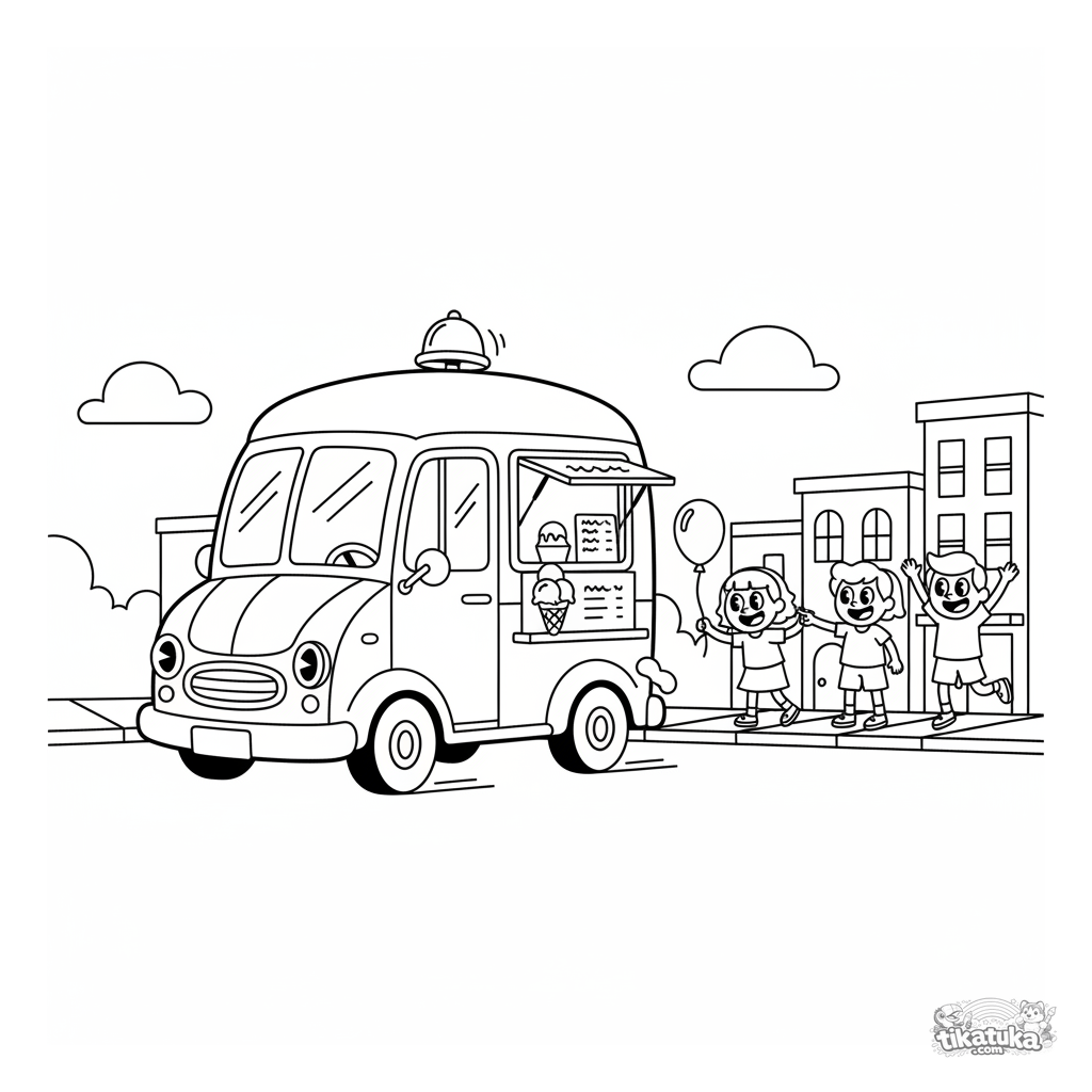 Ausmalbild für Kinder: ein Retro-Eiswagen fährt eine Stadtstraße entlang. Für Jungen im Alter von 4-6 Jahren.