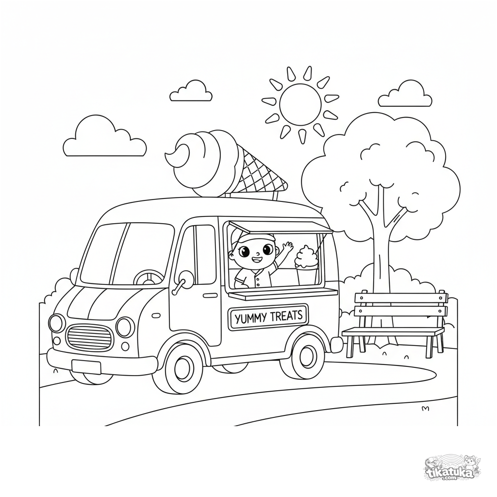 Ausmalbild für Jungen von 4-6 Jahren: Ein fröhlicher Retro-Eiswagen steht am Parkeingang. Erkennbare Formen, mäßige Details.