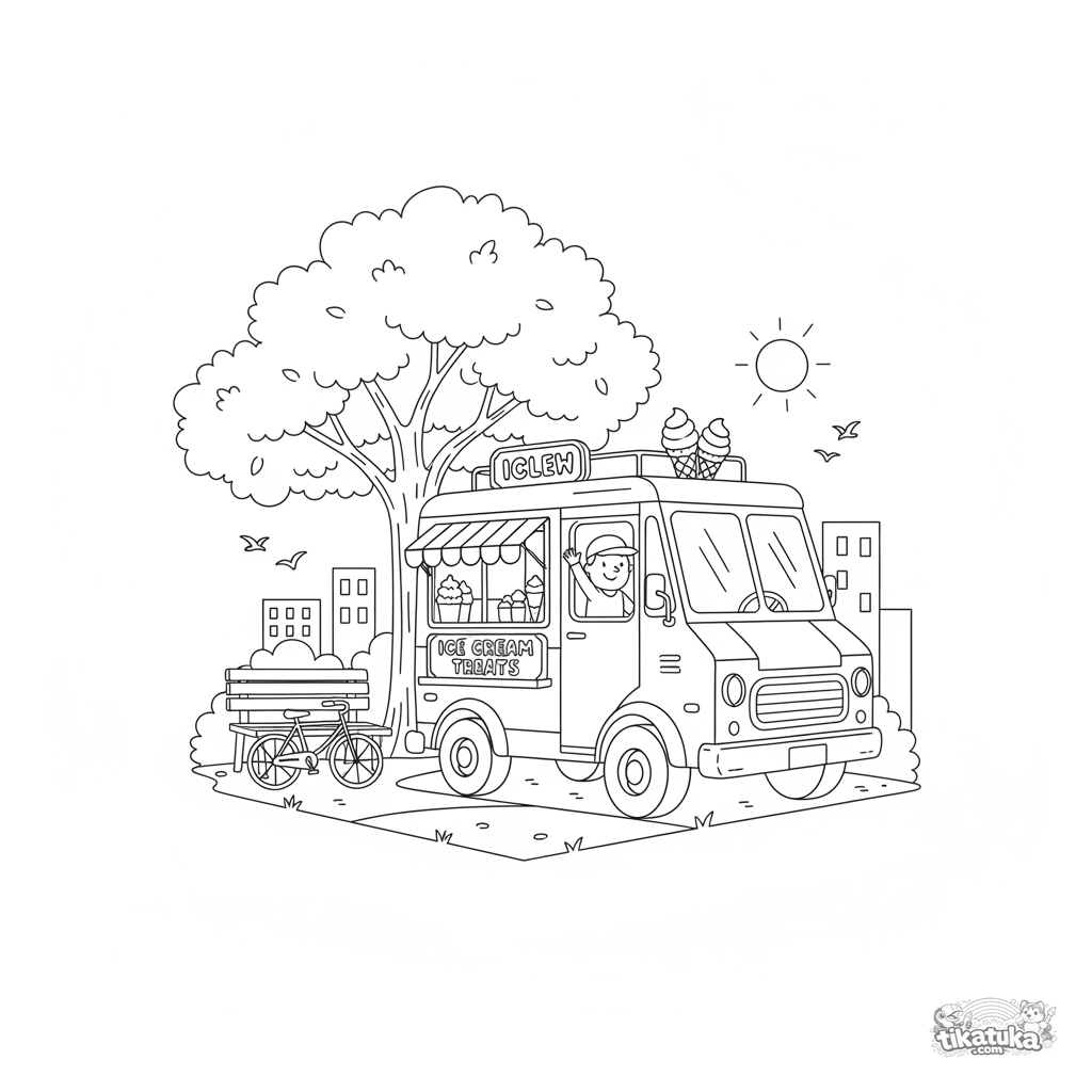 Ausmalbild für Jungen 4-6: Ein Retro-Eiscreme-Lastwagen parkt in einem Stadtpark. Realistische, aber klare Umrisse.