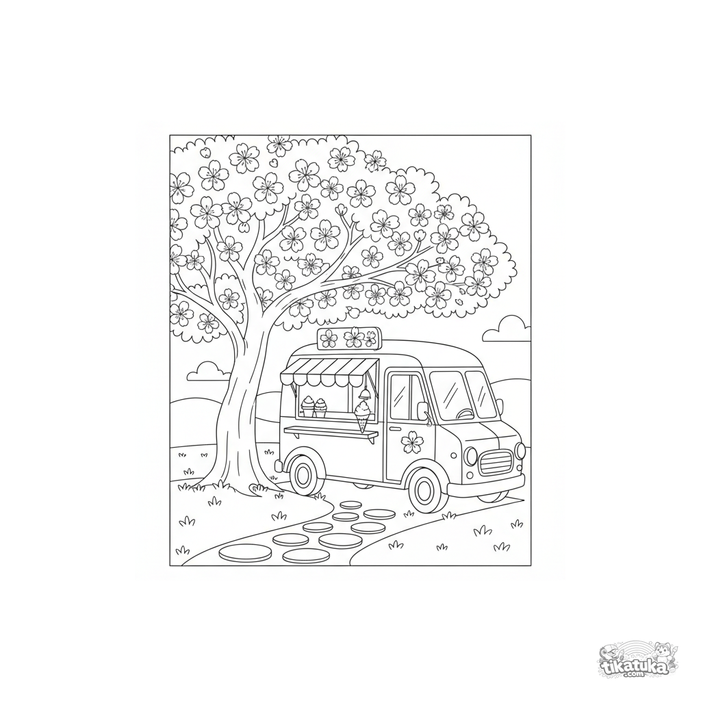 Ausmalbild eines Retro-Eiswagens, der unter einem blühenden Kirschbaum geparkt ist. Für Jungen von 4-6 Jahren.