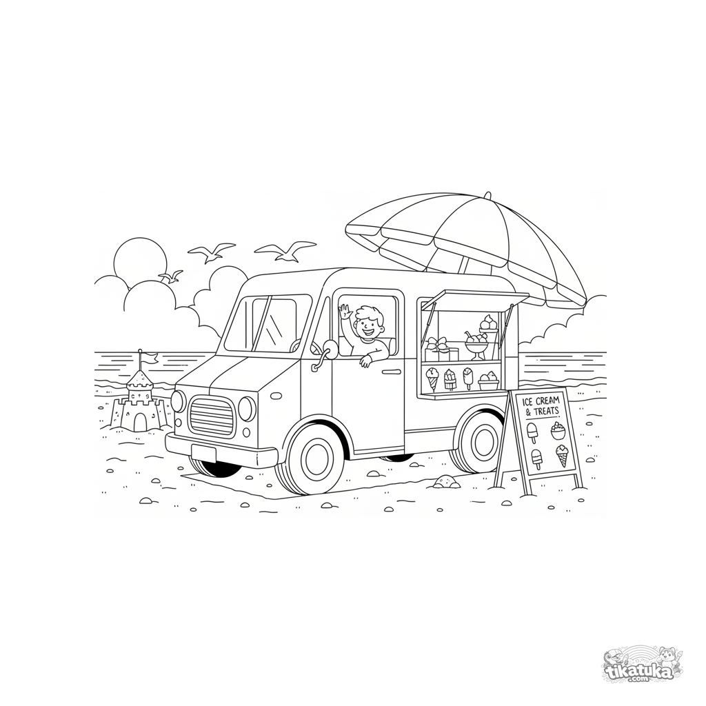 Ausmalbild für Jungen von 4 bis 6 Jahren. Ein altertümlicher Eiswagen ist unter einem großen Strandschirm auf dem Sand geparkt. Eine sommerliche und detaillierte Szene.