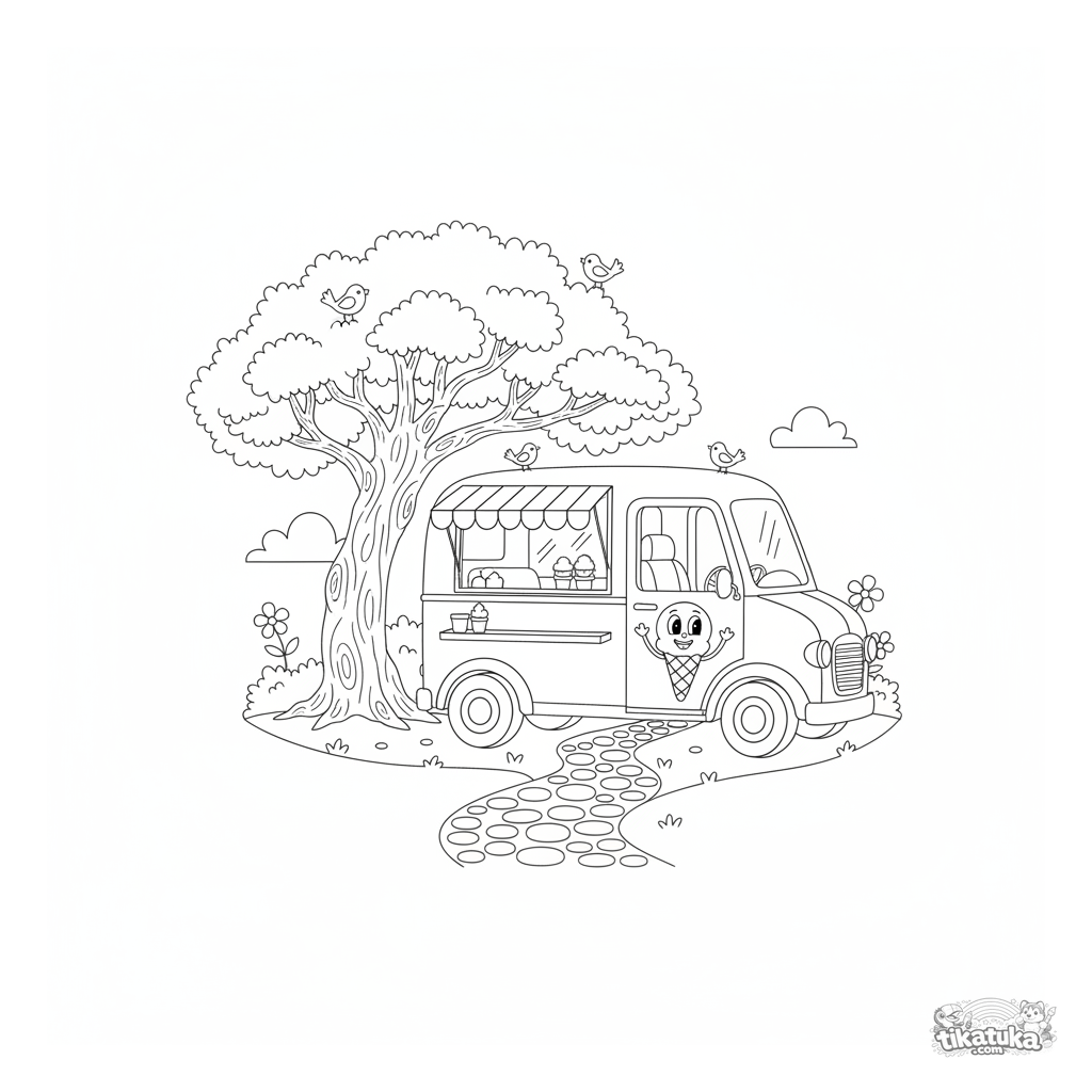 Ausmalbild für Jungen 4-6: ein charmanter Retro-Eiswagen wartet auf Kunden im Schatten eines großen Baumes. Ein detailliertes Fahrzeug.