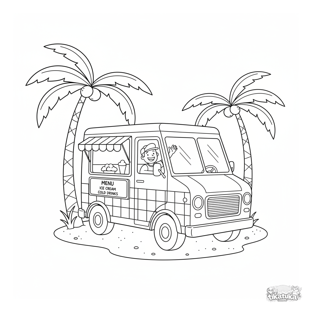 Ausmalbild für Jungen 4-6: Ein retro-karierter Eiswagen unter Palmen geparkt. Detaillierte Fahrzeugszene.