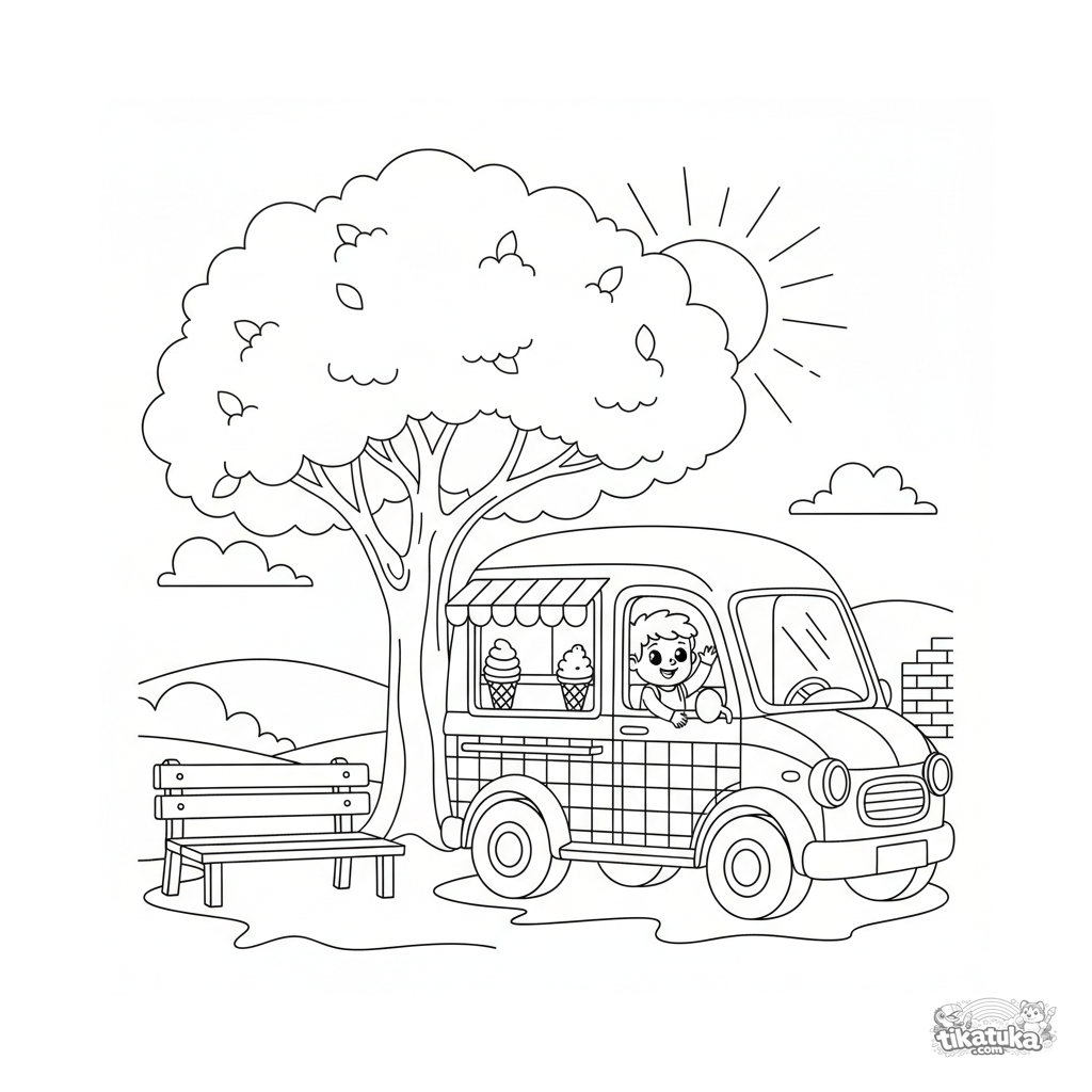 Ausmalbild für Jungen von 4-6 Jahren: Ein fröhlicher altertümlicher Eiscreme-Lastwagen mit Karomuster steht unter einem großen Baum geparkt.
