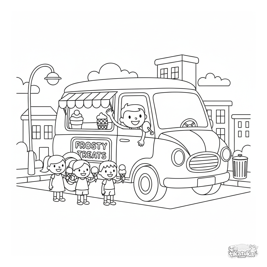 Ausmalbild für Kinder 4-6: ein Retro-Eiswagen auf einer Stadtstraße. Ein fröhlicher Fahrer verteilt Leckereien an Kinder. Einfache Formen.