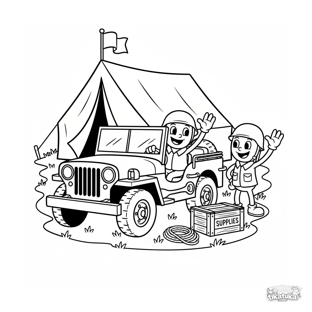 Ausmalbild für Kinder 4-6: Ein Vintage-Militärjeep parkt nahe einem Feldhauptquartierzelt. Ein fröhlicher Fahrer winkt. Einfache Formen zum Ausmalen.