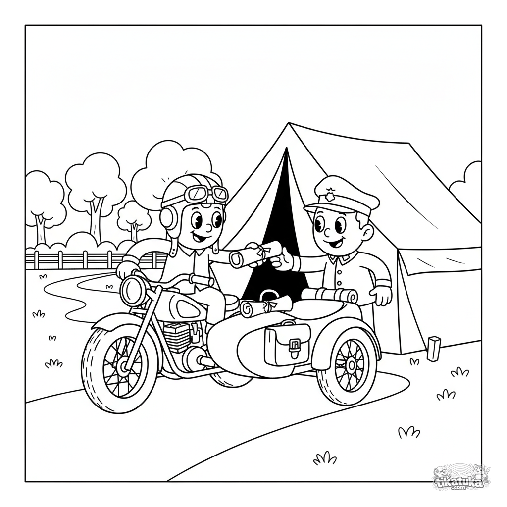 Ausmalbild für Kinder 7-9 im Retro-Stil: Ein Vintage-Armeemotorrad mit Beiwagen, auf dem ein Kurier Dokumente zum Kommandozelt bringt. Ein Offizier empfängt die Depesche. Dynamische Szene.