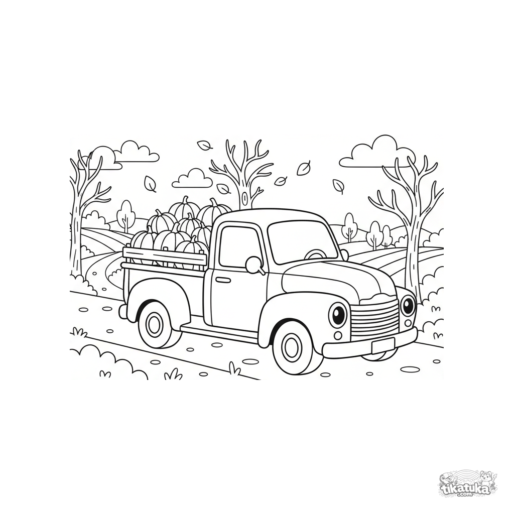 Ausmalbild für Jungen 4-6: Ein alter Pickup transportiert Kürbisse auf einer Herbststraße. Eine lebendige, aber nicht überladen detaillierte Szene.
