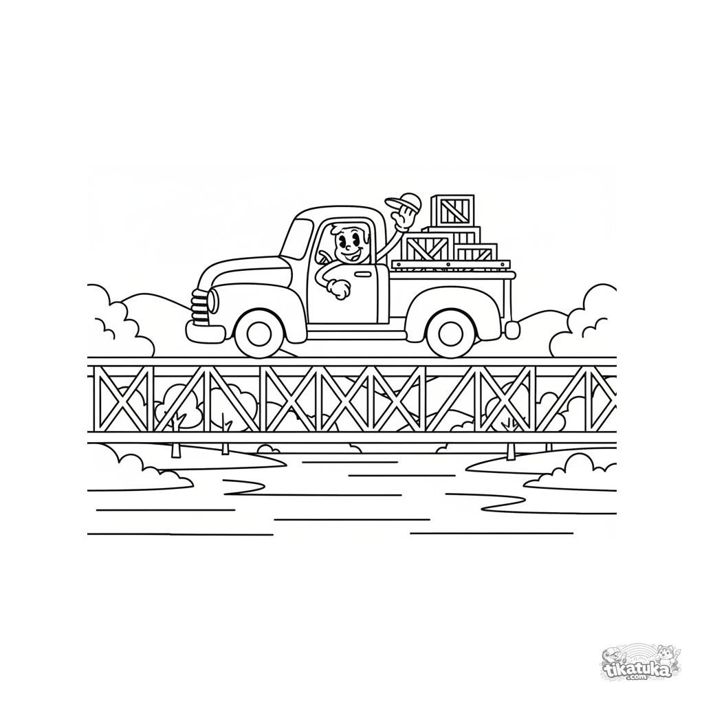 Ausmalbild für Kinder 4-6: Ein Retro-Pick-up fährt über eine Eisenbrücke über einen großen Fluss. Ein fröhlicher Fahrer winkt mit seiner Mütze.