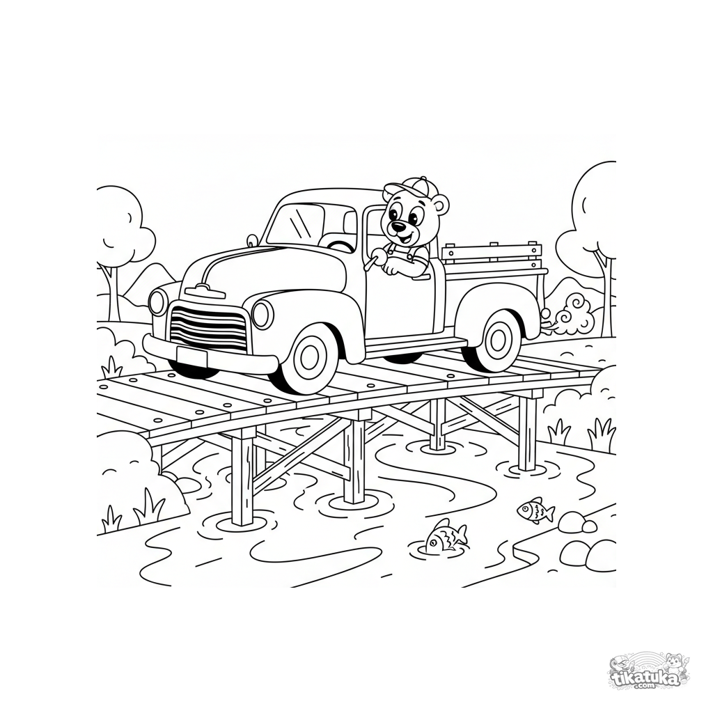 Ausmalbild für Kinder 4-6: Ein Retro-Pickup fährt über eine Holzbrücke über einen großen Fluss. Ein freundlicher Bärenfahrer schaut neugierig heraus. Einfache Formen, klare Umrisse.